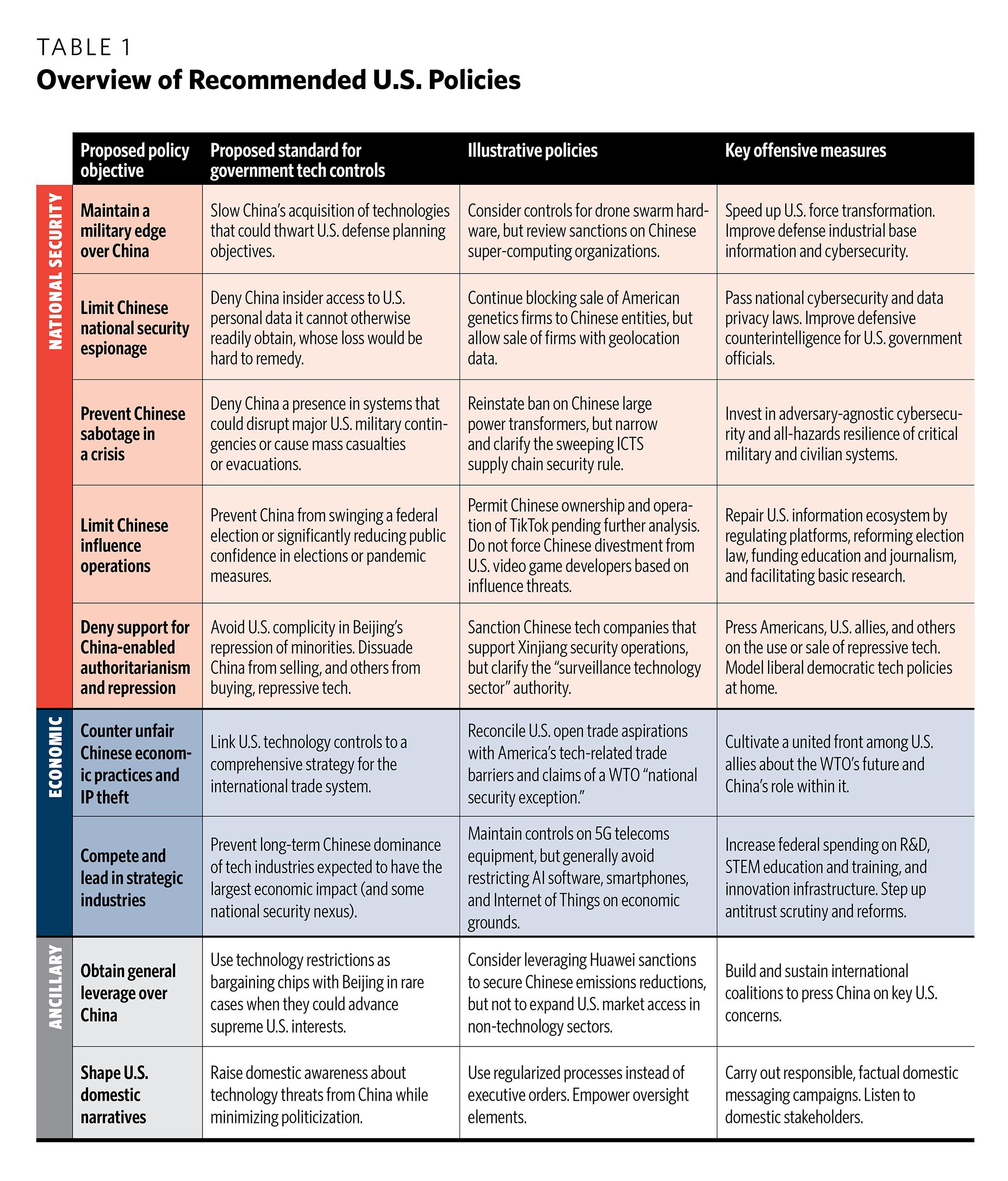 The next step, and the heart of this report, is a careful review of the role U.S. technology controls should play in achieving these policy objectives (see Table 1). Taking each objective in turn, the report weighs the risks and benefits of U.S.-China technological interdependence against the risks and benefits of U.S. government technology controls. This analysis leads to a series of proposed dividing lines—implementable standards for determining which technologies warrant restrictions and which do not. Specific examples help illustrate how these dividing lines would work in practice. Offensive measures essential to each objective are also highlighted. By considering the full gamut of U.S. interests across many different technology areas, the report shows what a centrist decoupling might look like and how agencies could implement it.