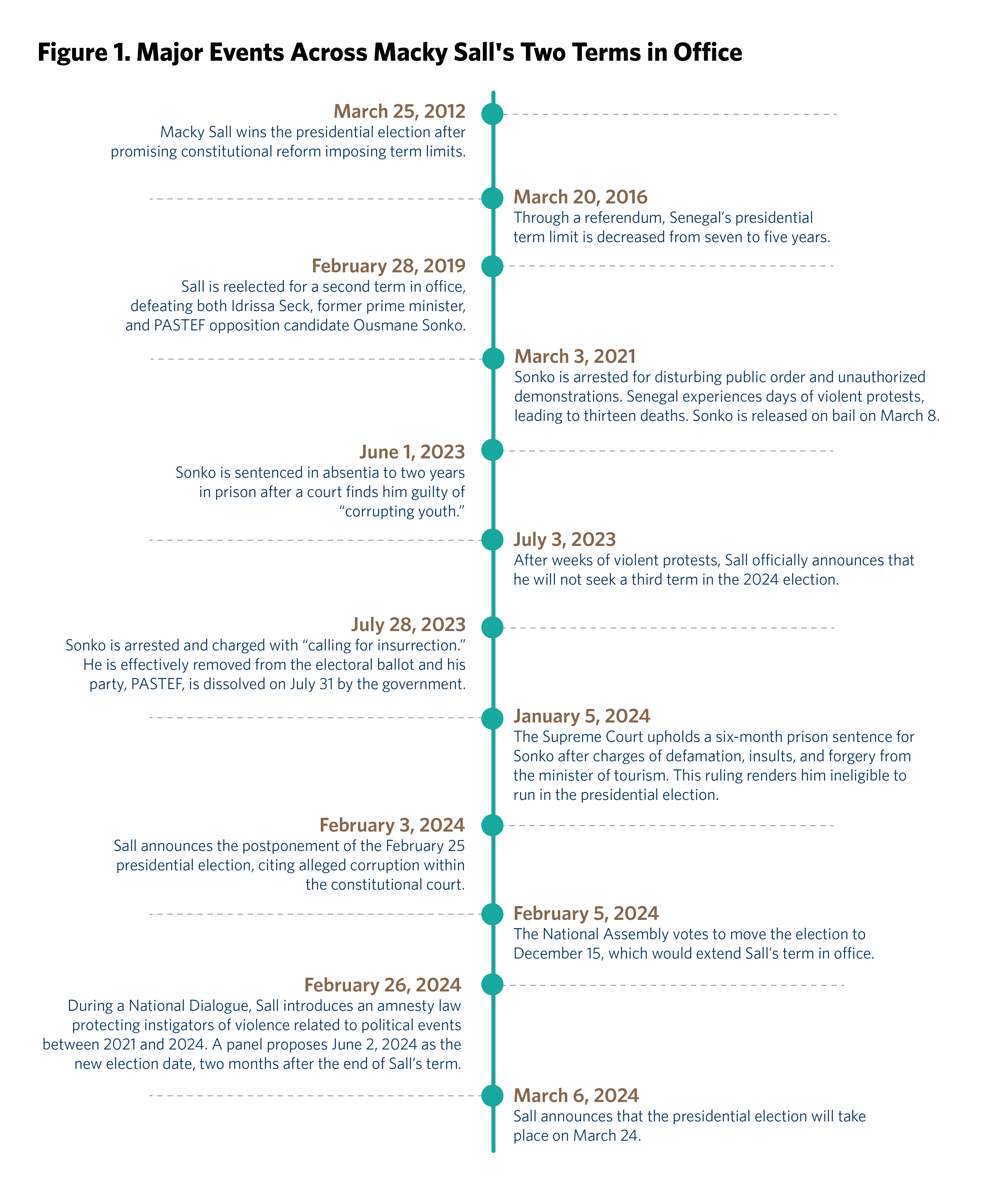 Thomas Carothers and Benjamin Press, in a paper on global democratic backsliding, argue that for a country to be considered a “democratic backslider,” it must have “achieved a significant level of democracy” and then “experienced significant erosion of democratic institutions,” often at the hand of “purposeful elite actors.”5 Senegal has long been heralded as one of the few stable democracies in West Africa, a region that has seen a trend of democratic backsliding since 2020, with coups d’état in Burkina Faso, Guinea, Mali, and Niger. However, threats to the country’s democratic credibility had been simmering for quite some time, and until the March 24 election seemed to temporarily place Senegal in the category of a “democratic backslider.”